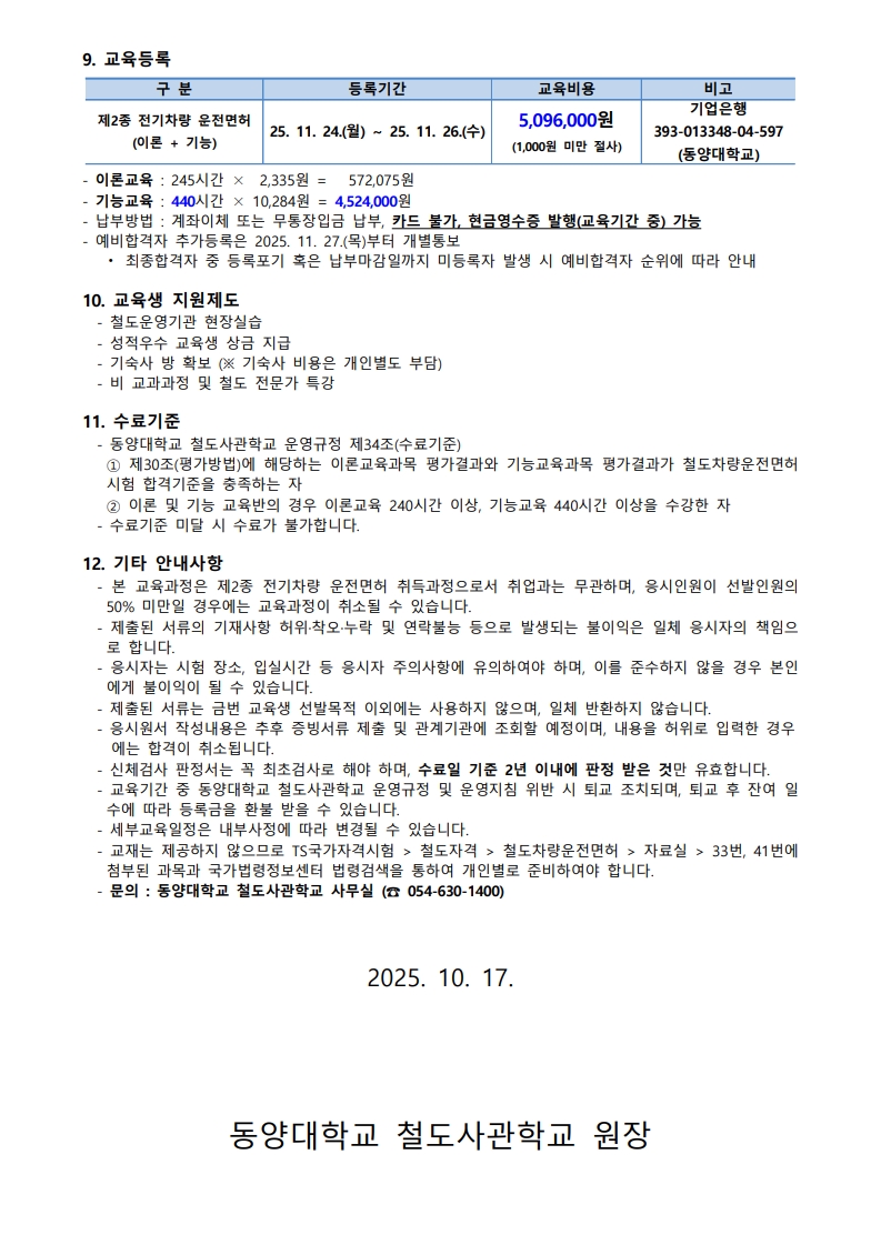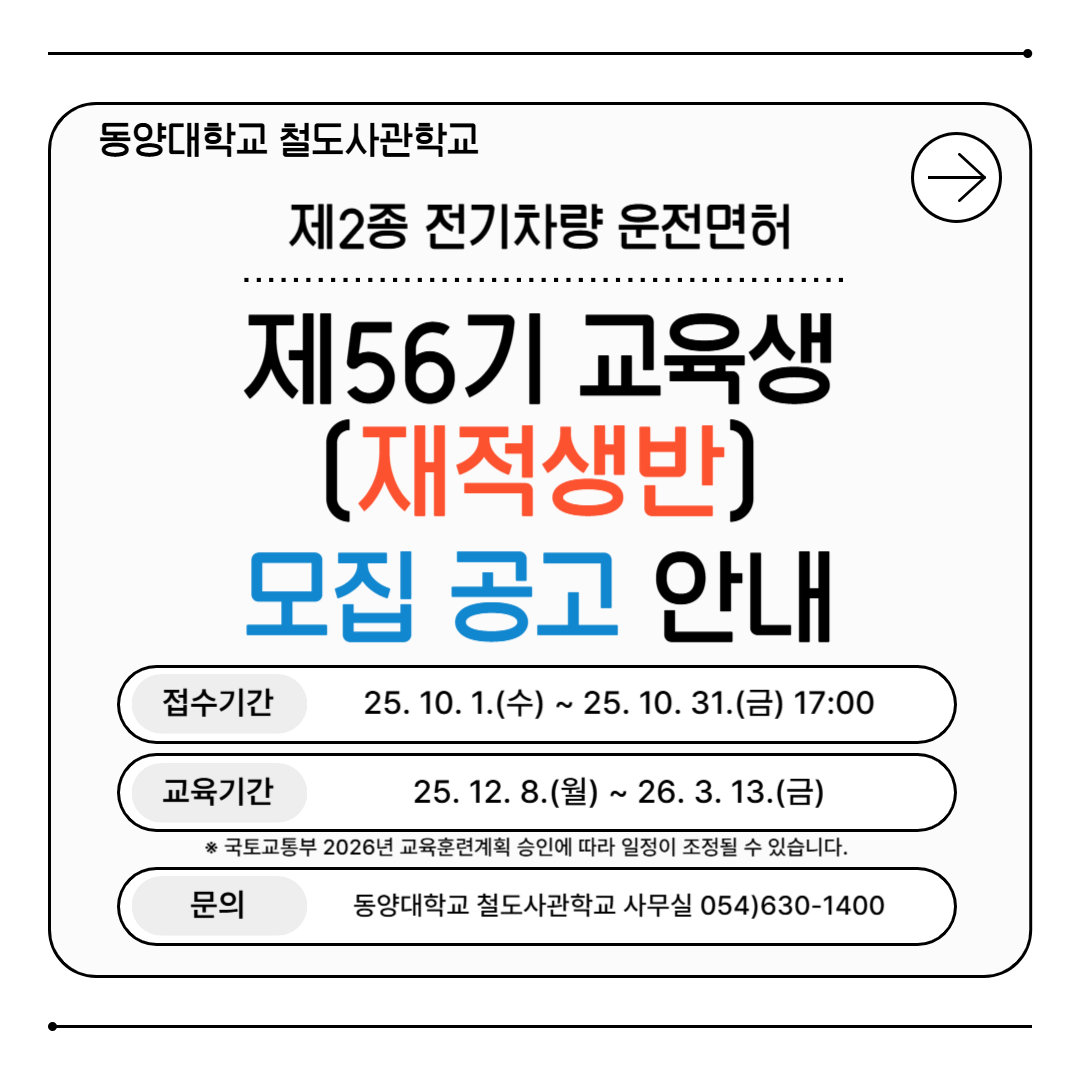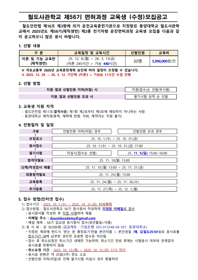 [철도사관학교] 철도사관학교 제56기(재적생반,이론+기능교육반) 교육생 모집 공고 안내